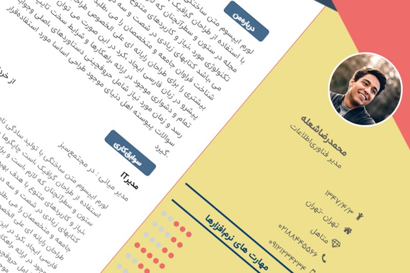 قالب مدرن رزومه ساز حرفه ای باش یک قالب مدرن دو ستونه عکس دار با معیارهای نمایش مهارت میباشد . رنگ های قرمز و زرد و آبی با خطوط کج بکار رفته در قسمت بالایی رزومه نشان از مدرن بودن رزومه کارجو دارد . رزومه دارای ۲ ستون میباشد که در ستون سمت راست اطلاعات کلی و فنی کارجو درج شده است و در ستون سمت چپ تجربیات کاری و تحصیلی کارجو نمایش داده میشود . در پایین رزومه بارکدی وجود دارد که با اسکن کردن آن رزومه آنلاین کارجو نمایش داده میشود .